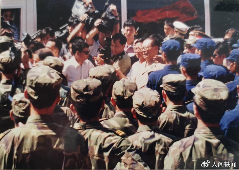 江泽民同志向正在加固堤防的官兵们讲话。
