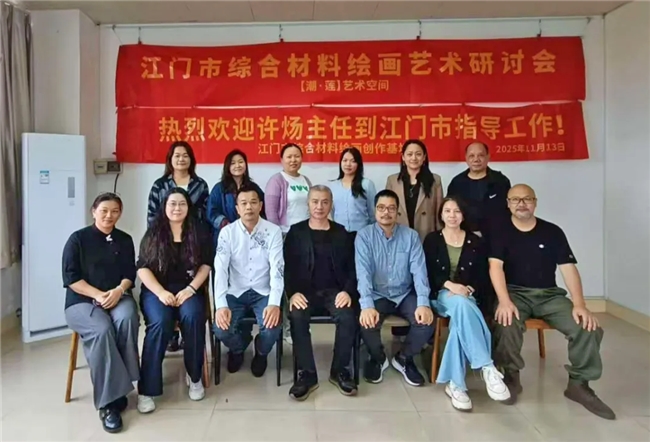 当日下午,许炀在潮连创作基地与江门市美协综合材料绘画创作重点作者座谈,围绕综合材料与侨乡文化、地方元素的融合等本土化问题深入交流,分析地域文化融入综合材料创作的实践案例,并建议筹备中的江门市美协综合材料绘画艺委会加强区域研讨,推动侨乡题材作品创作。