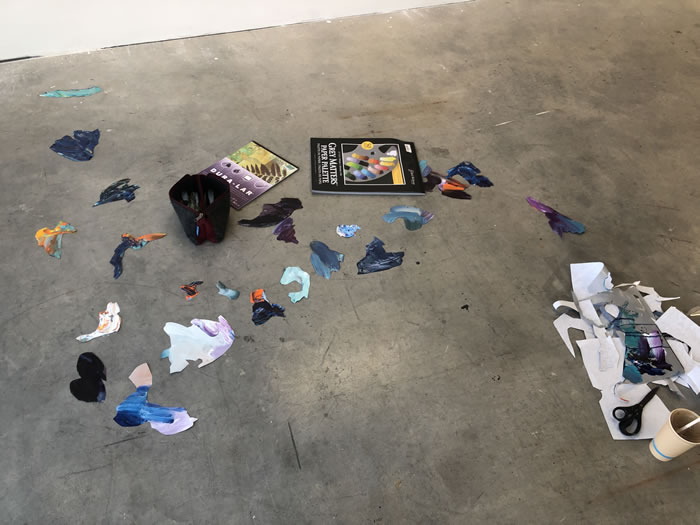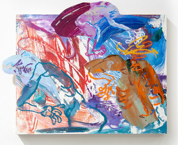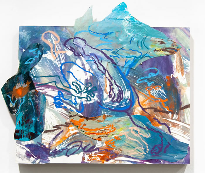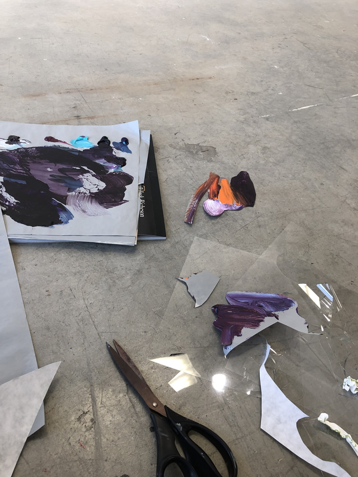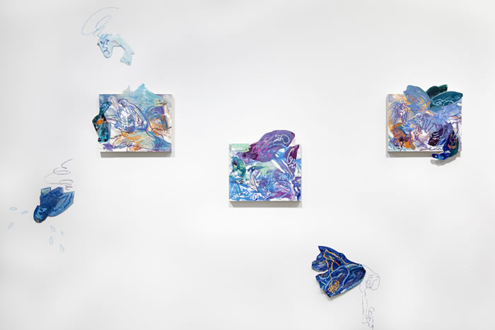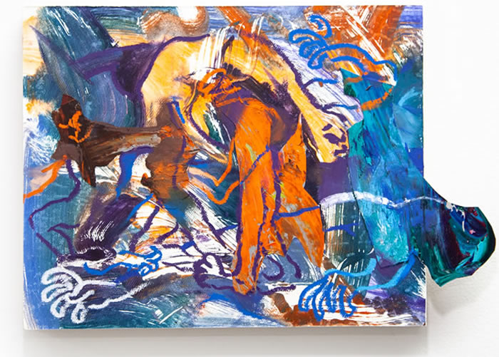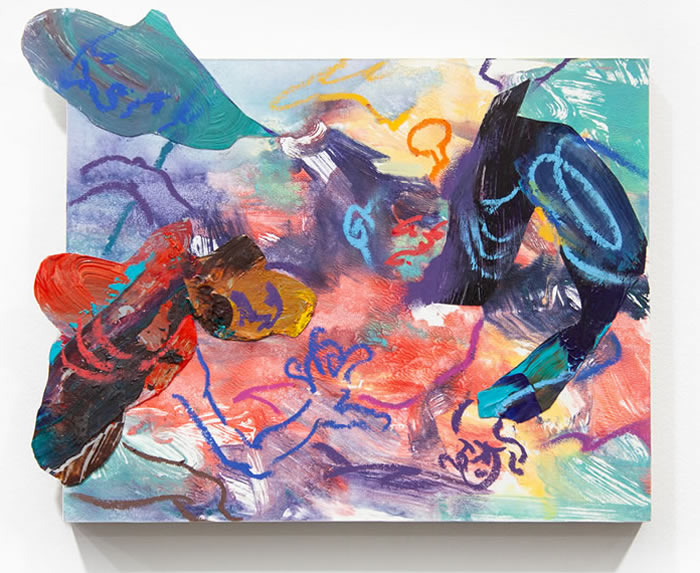 除此之外,他还通过拼贴元素进一步打破作品的边界:调色盘残骸被剪裁为不规则形状,转印复刻的亚克力版在肢解后被嵌入画面……龚若愚形容自己的创作为一种冥想与内观:“脑海中的场景就如同拼贴一样从来不是规则的,它的形状正契合了我的情绪边界。