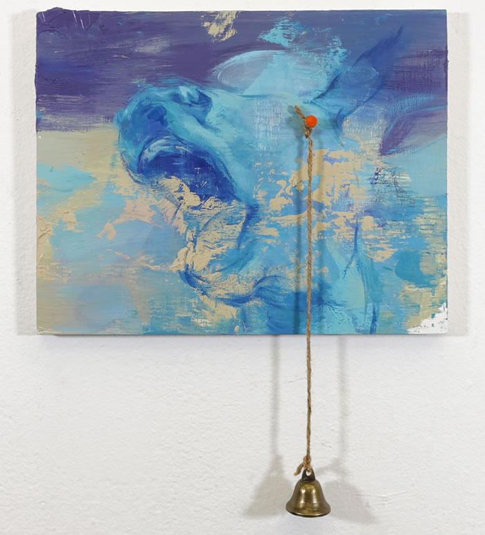 No Pause,9.25 x 16.25 x 2.25”,Sculpey, acrylic, canvas, oil, dura-lar collage, nail, bell, jute twine on board,2025