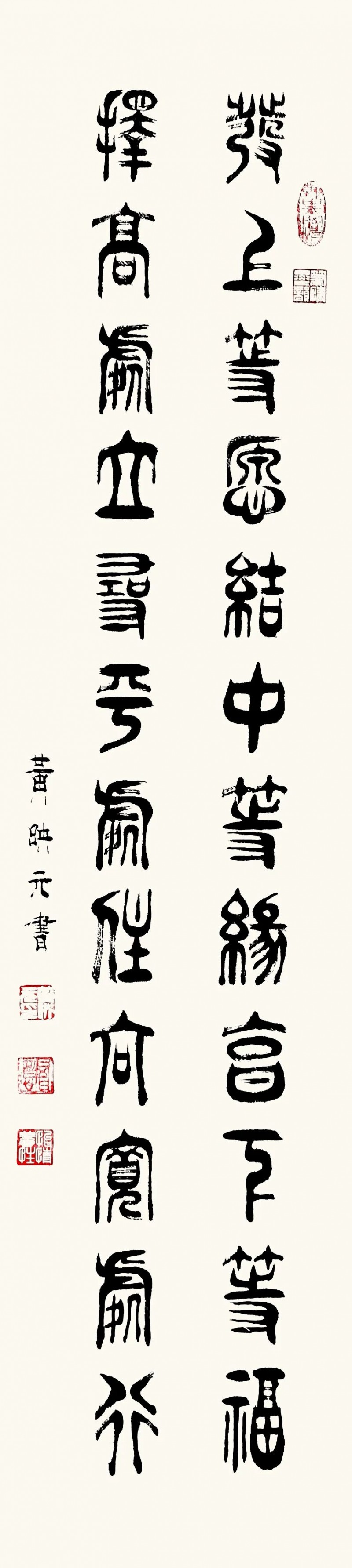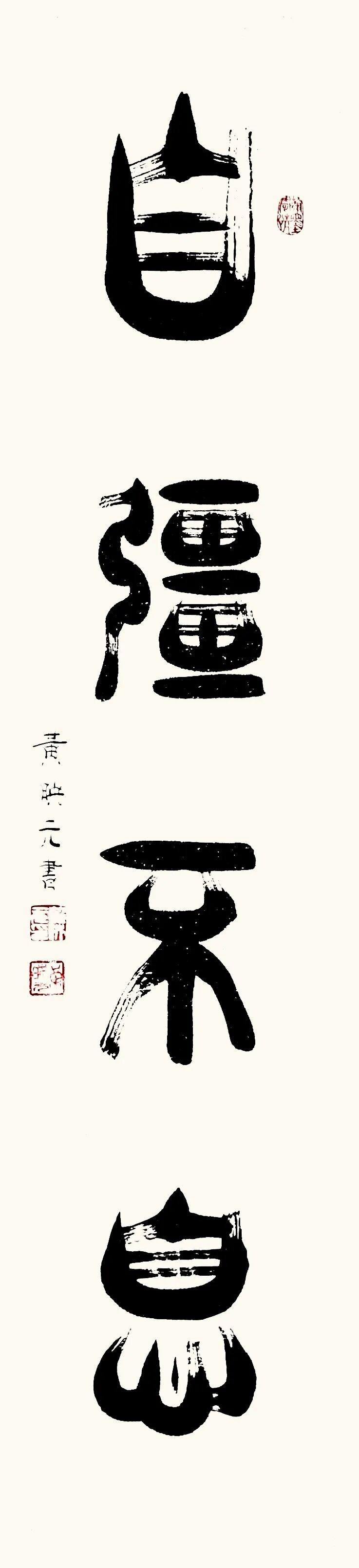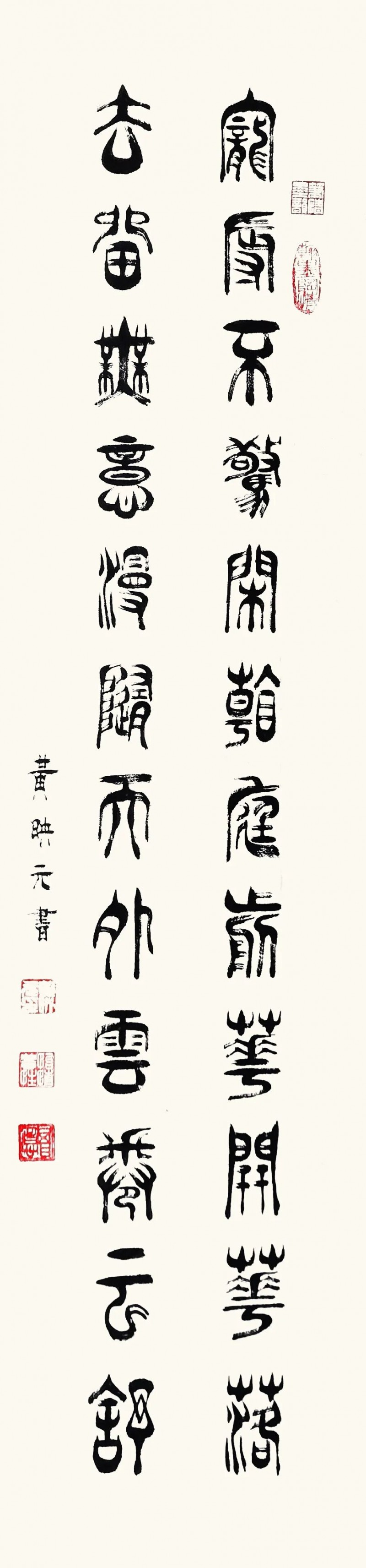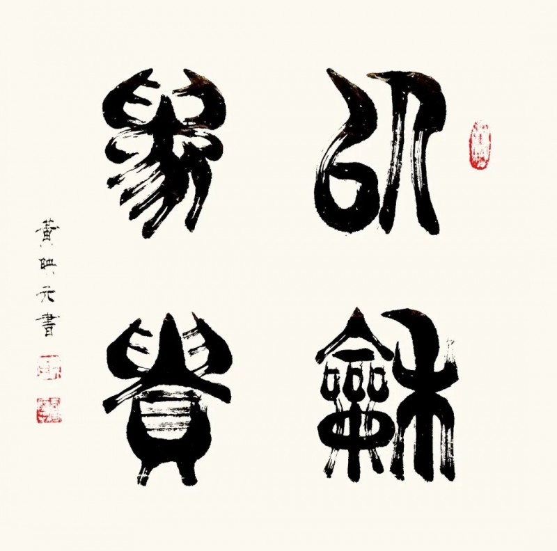 篆书作为一种古老而庄重的书体,承载着中华民族千年的文化积淀。在文化复兴的全新时代里,黄映元先生的篆书艺术不仅具备极高的文化弘扬价值,还拥有极强的装饰性,能够美化现代人的生活环境,成为当代美学的琼花玉蕊。黄映元先生的篆书以穿越时空的文化使者,将传统艺术之美引入现代文化生活空间,使人们能够感受到古典的宁静高雅。《书论》亦论:夫书者,玄妙之技也,若非通人志士,学无及之。黄映元先生的作品,以通人之法与志士之功为加载,不仅能够装点居室增添文化气息,还能陶冶人们的文化情操,使心灵得到净化升华。